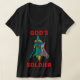 Esta camiseta de cuello y cuello alto de mujer tiene las palabras Soldado de Dios en letra negrita más letras rojas con un soldado con armadura completa sosteniendo una espada más un escudo en el centro con un tema basado en la fe. Esta teta es de color y costura para una mujer hecha con tela ligera para mayor comodidad.
