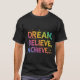 El diseño de la camiseta muestra el texto "Dream" (sueño). Creer. Lograr..." en un gradiente de colores vibrantes, con formas abstractas y patrones alrededor. El diseño es atrevido y llamativo, los colores son vivos y luminosos. El texto está escrito en negrita, y las palabras se espacian uniformemente. El diseño se centra en el pecho de la camiseta y está rodeado por un borde blanco. El diseño es sencillo pero eficaz, y sin duda captará la atención de cualquiera que lo vea.