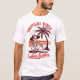 Esta camiseta blanca muestra una imagen de un esqueleto vestido con una gorra de gran tamaño, sentada en una playa al lado de una palmera. El texto "VIBOS TROPICALES" está en la parte superior, y "Verano eterno" está en una letra de guión debajo. Los pájaros vuelan en el cielo coloreado de la puesta del sol. El diseño sugiere un enfoque humorístico para disfrutar del más allá en un entorno tropical.