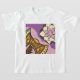 This artwork features a stylized axe and a flower, each rendered in a flat, geometric style with bold outlines. The axe has an ornate design with a brown handle and a yellow and brown head, decorated with circles and lines. The flower has light purple petals and a yellow center, with a few green leaves. The background is a solid purple color, and the axe and flower are placed asymmetrically. The overall design is decorative and eye-catching, combining elements of nature (the flower) and human craft (the axe) in a stylized and somewhat abstract manner. The contrast between the sharp, angular axe and the soft, rounded flower creates visual interest.