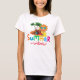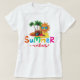 Camiseta femenina con vibraciones de verano con un sol sonriente, palmeras, gorra de playa, gafas de sol, pez estrella y una cámara de turismo. Esta camiseta femenina de verano de diseño tropical es perfecta para ayudarle a entrar en el hermoso modo de vacaciones.