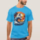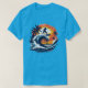 A vibrant blue T-shirt featuring a bold, artistic surf scene. The design showcases a powerful ocean wave curling beneath a warm sunset sky, with palm trees and a surfer mid-ride, creating a dynamic tropical vibe. The painterly style and high-contrast colors give it an energetic, beach-inspired look—perfect for surfers, ocean lovers, or anyone who enjoys a laid-back summer aesthetic