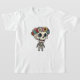 This enchanting illustration features an incredibly cute, chibi-style skeleton character that blends spooky with sweet. The little figure stands with a wide, friendly grin and enormous, sparkling teal eyes that radiate happiness. Adorning its oversized skull is a vibrant, lush flower crown overflowing with red roses, yellow sunflowers, blue daisies, and pink blossoms nestled among green leaves. The artwork uses clean lines and bright colors to create a whimsical, cheerful interpretation of a typically spooky subject, perfect for a lighthearted gothic aesthetic.