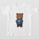 An adorable cartoon brown bear standing with a cheerful expression, holding a white mug of hot coffee or cocoa with visible steam rising. The bear is dressed in a cozy casual outfit featuring a blue zip-up hoodie and dark trousers, highlighting a friendly and warm character design perfect for cozy themes.