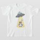 A humorous cartoon scene showing a wide-eyed cow standing under a glowing yellow beam from a classic flying saucer. The UFO hovers above with metallic details and small glowing lights, creating a playful sci‑fi vibe. The cow’s round body, tiny hooves, and surprised expression add charm and comedy, while a small speech bubble saying “Moo!” enhances the fun storytelling. Clean lines, bright colors, and strong contrast against the dark background make the illustration bold and eye-catching.