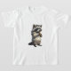 This charming illustration features a highly detailed, fluffy raccoon standing upright and dressed in a stylish cream-colored hoodie. The sweatshirt is adorned with a playful pattern of yellow and blue stars, complete with a cozy hood and front pocket. The raccoon's expressive dark eyes and delicate whiskers are captured with lifelike precision, while its tiny paws carefully cradle a single, textured acorn. Set against a clean, neutral background, the soft fur textures and whimsical character design create a heartwarming and endearing aesthetic.