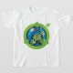Una rana verde sobre un globo terrestre como diseño ambiental. Este diseño se ve realmente efectivo en esta camiseta para niños