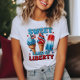 Dulce Tierra de la Libertad 4 de Julio T-Shirt. © Tees & Sweats at Zazzle. Este 4 de julio, día de la independencia, tiene un diseño con helados en el centro y el mensaje Tierra dulce de la libertad, todo en rojo, blanco y azul.