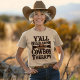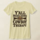 Todos Necesitan Camiseta De Terapia De Vaquero. © Tees & Sweats at Zazzle. Este tee tiene el mensaje "Todos necesitamos un poco de terapia de vaqueros".