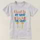 En esta camiseta apropiada de verano, el naranja rojo y el azul del océano dicen "Beba en mi mano, dedos en la arena". El diseño se completa con imágenes de bebidas tropicales y una hamaca entre palmeras.