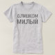 Una escritura de la libre-forma de la versión cirílica rusa de la frase inglesa "demasiado linda", impresa en el área del pecho. En inglés, esta frase del ruso se pronuncia áspero como "slishkom milly."