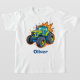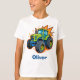 Esta camiseta personalizada para niños presenta un potente tractor de granja verde con acentos azules y neumáticos grandes y escarpados, ambientados en un fondo enérgico y estilizado.