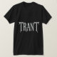 Delante mínimo con "Trant" en negrita, contrastado por un diseño abstracto y texto críptico en la parte trasera, hecho para los que usan misterio y borde con estilo.
