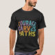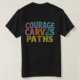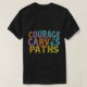 El diseño de la camiseta incluye la frase "Coraje de carriles" en letras en negrita y multicolor. Los colores vibrantes y el tipo de letra dinámico crean una declaración visualmente llamativa e inspiradora. El diseño transmite un mensaje de perseverancia, determinación y el poder del coraje para superar los desafíos y crear nuevas oportunidades.
