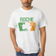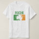 Una camiseta que ofrece un trébol blanco, verde, y anaranjado irlandés apenado con el apellido Roche.