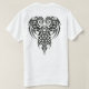 An intricate, symmetrical piece of tribal line art that forms the silhouette of a heart or shield. The design features interlocking curved blades, sharp spikes, and circular flourishes at the top. The metallic, shaded texture gives the graphic a three-dimensional appearance