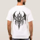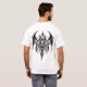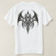 A symmetrical graphic featuring sharp, blade-like tribal patterns that mimic the shape of a winged totem. The design uses a monochromatic palette with heavy shading to create a textured, three-dimensional metallic look