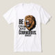 Una camiseta blanca con el verso "Sé fuerte y valiente" de Josué 1:9 en negrita, letras mayúsculas cerca del fondo. Encima del texto, hay un rugido león con un hombre dorado