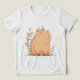Un bonito capibara se sienta contentosamente entre pequeñas plantas verdes y un fondo marrón. Su expresión es tranquila y entrañable, lo que añade un encanto caprichoso a la escena.