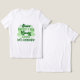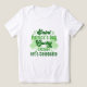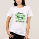 La imagen muestra a una persona usando una camiseta blanca con texto verde y gráficos de champú. El texto de la camiseta dice: "El Día de San Patricio, un irlandés afortunado celebremos". Esta imagen es relevante, ya que representa las prendas festivas que se usan habitualmente durante las celebraciones del Día de San Patricio, destacando los temas de suerte y el patrimonio irlandés.