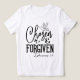 This powerful white tee affirms the wearer's identity: "Chosen & FORGIVEN", referencing Ephesians 1:4. The flowing script and bold block fonts, complemented by the dove graphic, symbolize divine selection, peace, and grace.