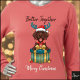 The dog is drawn in a happy, stylized manner, showing a dense brown coat and expressive eyes. It is positioned sitting behind and resting its paws on a wrapped gift box. The dog is dressed for the holidays with a red Santa Hat and a red and white striped Scarf patterned with snowflakes. It also wears teal blue Reindeer Antlers decorated with hanging gold ornaments. The gift box is a contrasting Teal Blue and Gold Striped pattern, topped with a large gold bow. Scattered red and yellow/gold Christmas balls are visible around the base. The background is a plain light gray.