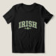 Show your Irish spirit with this classic t-shirt design. Featuring the word 'IRISH' in a bold, arched font, it's accented by three shamrocks and subtle star details below, all in a traditional green outline.