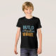 El diseño de la camiseta muestra la frase "Construir más allá de los límites", que se muestra de manera prominente en tipografía audaz y moderna. Las palabras se basan en un fondo dinámico y abstracto que sugiere movimiento y potencial ilimitado. El diseño general transmite una sensación de ambición, innovación y el poder para superar obstáculos.