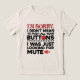 Esta desenfadada camiseta de novedad es la manera perfecta de burlarse de esos momentos en los que accidentalmente dices lo que no debes y parece haber presionado los botones de alguien. El lema humorístico: "Lo siento, no quería apretar todos tus botones. Estaba buscando silencio" es seguro que se va a reír y encender una conversación. Ya sea que lo estés llevando a un fiesta, haciendo compras o haciendo recados, esta camiseta es una manera segura de darle un toque de humor a tu día.