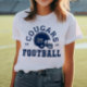 Personalizado Front and Back Football T-Shirt para Mamá - mostrado en White Design para las madres futbolísticas muestra un casco de fútbol con texto deportivo que se puede personalizar para el nombre del equipo, el apellido del hijo y su número de camiseta. Los colores gris plateado y azul marino se pueden personalizar.