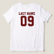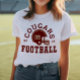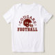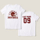 Personalizado Front and Back Football T-Shirt para Mamá - mostrado en White Design para las madres futbolísticas muestra un casco de fútbol con texto deportivo que se puede personalizar para el nombre del equipo, el apellido del hijo y su número de camiseta. Los colores dorado y rojo oscuro se pueden personalizar.