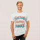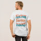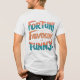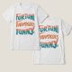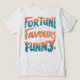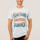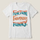 El diseño de la camiseta incluye la frase "Fortune Favors Funny" en letras en negrita y multicolor. El texto está organizado en un estilo lúdico y vibrante, cada palabra utiliza un tipo de letra y un color diferentes para lograr un efecto visualmente llamativo. El diseño es ideal para los que aprecian el humor y creen que una actitud positiva puede conducir a la buena fortuna.