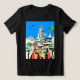 Camiseta en un ilustracion de tres elegantes gatos vestidos como turistas de pie ante un paisaje urbano futurista. La arquitectura evoca la estética de ciencia ficción de mediados de siglo. Los gatos sostienen cámaras, mapas y usan patios, lo que sugiere aventura. Las palmeras y el brillante cielo azul realzan el ambiente vacacional.