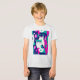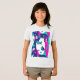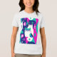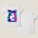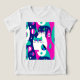 Camisas de inspiración moderna de mediados de siglo con dos gatos estilizados de formas audaces y geométricas de turquesa, magenta, azul oscuro y blanco. Los patrones abstractos y las formas retro llenan el fondo, dándole una sensación divertida y vintage con un borde minimalista.
