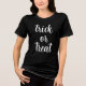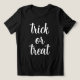 Trick moderno o truco para tratar la camiseta de Halloween de estilo moderno para mujeres. Esta función de diseño de camisetas es texto con letras blancas.
