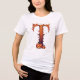 This is a festive, spooky illustration featuring an ornate, glowing orange letter 'T' that looks like an ancient, horned pillar, decorated with autumn leaves and vines. It is centered above two glowing, grinning jack-o'-lanterns nestled in a pile of fallen leaves against a dark, hazy teal background.