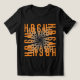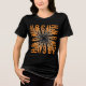 Un diseño dinámico de camisetas con un patrón giratorio de letras superpuestas, principalmente "H", "B", "C" y "U". Las cartas están dispuestas de manera caótica pero visualmente atractiva, creando una sensación de movimiento y energía. El uso de tonos contrastantes de naranja y gris añade profundidad y dimensión al diseño.