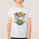 Esta ropa personalizada para niños presenta un avión de bomberos amarillo y rojo que rocía agua sobre un bosque feliz con árboles y nubes alegres.