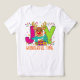 joy reindeer shirt, Christmas tee, festive design, red nose reindeer, green scarf deer, wrapped gifts, candy accents, cheerful holiday wear, winter fashion, seasonal celebration