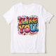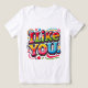 El diseño de la camiseta "I Like You" presenta una tipografía juguetona, dibujada a mano, con un ambiente divertido y acogedor. El texto está dispuesto en un estilo casual y fluido, con colores vivos y audaces que atraen la atención. Alrededor de las palabras, doodles alegres como corazones, estrellas o rostros sonrientes pueden dispersarse, agregando una energía optimista y positiva al diseño. El conjunto es alegre y acogedor, por lo que es perfecto para expresar el afecto de una manera bonita y elegante.