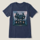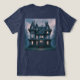 Camiseta de la casa embrujada. Esta es una camiseta de la casa embrujada. El arte digital presenta una antigua casa embrujada con neblina. La casa es una casa de tres plantas con luces en las habitaciones. La imagen está a ambos lados de la camiseta. Puede cambiar la imagen con el botón Personalizar. La camiseta es una nueva camiseta de la armada tripartita.