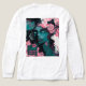 Composición más expresiva y abstracta: rostro femenino con contrastes bicolor, trazos fluidos, manchas y líneas que generan movimiento y profundidad. La flor central actúa como sello botánico de la colección, manteniendo la estética neon teal & pink para una línea uniforme en cojines, sudaderas y pósters.