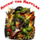T-Rex Dinosaur playing an electric guitar. This fierce green Tyrannosaurus Rex is shredding an electric guitar amid flames and lightning. This fun, bold illustration blends heavy metal attitude, rock music energy, and dinosaur fandom into one unforgettable illustration.