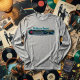 Printed on an Athletic Grey men’s long sleeve t-shirt, the deep navy lines and muted retro colours stand out without overpowering the garment. The result is a relaxed vintage aesthetic that feels effortless whether you're cruising through town, spinning records at home, or heading out for a night drive.