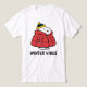 This classic short-sleeve T-shirt features the beloved Snoopy character prominently displayed in the center. The graphic shows Snoopy dressed warmly for cold weather in a large, puffy red winter coat and a blue and yellow knit cap. This shirt is a fun and comfortable apparel item, perfect for everyday wear, holiday celebrations, or as a cozy layer during the winter season.