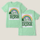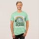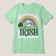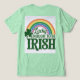 Esta camiseta verde presenta un arcoíris con el guión Lucky y el texto Suficiente para ser irlandés con un shamrock verde en el lado izquierdo. Hay líneas curvas blancas entre los colores bonitos del arco iris. La camiseta es una camiseta de Bella Canvas Tri-Blend.