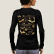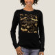 A t-shirt pattern on deep black: ornate golden bats with lace-detailed wings soar among blooming roses, peonies, and curling vines. Metallic gold filigree and vintage botanical illustrations create an opulent Victorian gothic garden effect. Elegant, mysterious, and dripping with dark-romance luxury. Timeless material for many occasions.