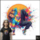 Background/Style: The figure is positioned against an abstract background of explosive paint splatters (pink, blue, yellow, orange) that radiate from a large orange/yellow circular shape. The style is energetic, urban, and expressive.