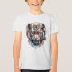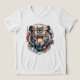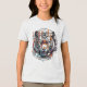 La imagen es una obra de arte digital que presenta la cara de un tigre estilizado como sujeto central. La cara del tigre está pintada con colores vivos, como tonos naranjas, blancos, negros y azules y rosas, lo que crea una expresión dinámica y feroz.