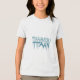 El diseño de la camiseta es para un postre llamado "Tiramisu Titan". El texto está escrito en una fuente goteante, estilo graffiti, con cada letra en un tono de azul diferente. El diseño tiene un fondo oscuro.